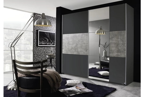 Moderná šatníková skriňa so šírkou 218 cm s posuvnými dverami. Tmavé sivé plochy sú kombinované pruhmi zrkadiel a imitáciou šedého betónu – spoločne tak vytvára veľmi zaujímavú optiku do moderne ladené spálne či šatne.