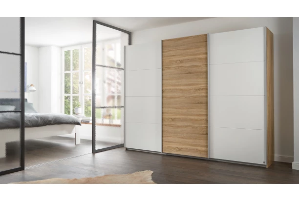 Praktická šatníková skriňa s celkovou šírkou 271 cm obsahuje 3 posuvné dvere na kvalitnom závesnom mechanizme. Vyrobená v kombinácii dekore dub sonoma / biela. Vnútorné priestory možno navyše doplniť aj o ďalšie police – ľahko si tak kedykoľvek prispôsobíte vnútorný priestor podľa vlastných potrieb.