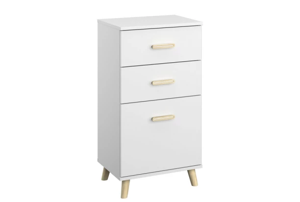 Komoda s otočnými dverami a zásuvkami o celkovej celkovou šírkou 47 cm z kolekcie Kolding v pôvabnom škandinávskom štýle, ktorý je obľúbený naprieč generáciami. Biele línie nábytku dopĺňajú prvky masívneho jaseňového dreva pre vytvorenie naozaj štýlovej atmosféry v priestore spálne alebo aj inej miestnosti.