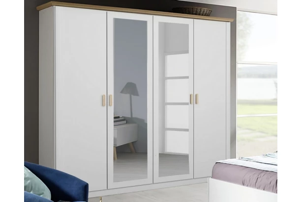 Šatníková skriňa s 2 zrkadlami o celkovej šírke 187 cm z kolekcie Kolding v pôvabnom škandinávskom štýle, ktorý je obľúbený naprieč generáciami. Biele línie nábytku dopĺňajú prvky masívneho jaseňového dreva pre vytvorenie naozaj štýlovej atmosféry v priestore spálne.
