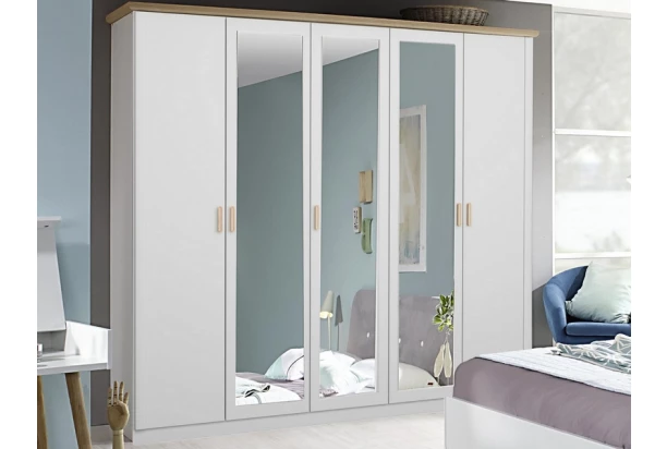 Šatníková skriňa s 3 zrkadlami o celkovej celkovou šírkou 232 cm z kolekcie Kolding v pôvabnom škandinávskom štýle, ktorý je obľúbený naprieč generáciami. Biele línie nábytku dopĺňajú prvky masívneho jaseňového dreva pre vytvorenie naozaj štýlové atmosféry v priestore spálne.