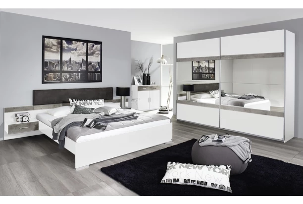 Moderná biela šatníková skriňa so šírkou 226 cm z kolekcie Penzberg je doplnená zaujímavými aplikáciami v imitácii šedého betónu a plochami zrkadiel – môže byť skvelou inšpiráciou pre vybavenie módernej spálne.