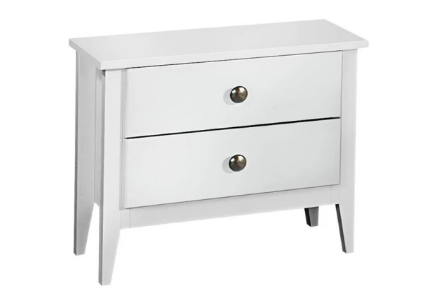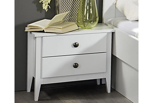 Nočný stolík s 2 zásuvkami z kolekcie Rosenheim – vychutnajte si romantické čaro bieleho nábytku s nádychom vidieckeho štýlu. Dekoratívne rámy, univerzálnosť bielej farby aj kvalitné spracovanie prispievajú k vytvoreniu príjemnej atmosféry v priestore spálne.