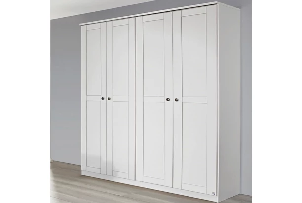 Šatníková skriňa so 4 otočnými dverami s celkovou šírkou 181 cm z kolekcie Rosenheim – vychutnajte si romantické čaro bieleho nábytku s nádychom vidieckeho štýlu. Dekoratívne rámy, univerzálnosť bielej farby aj kvalitné spracovanie prispievajú k vytvoreniu príjemnej atmosféry v priestore spálne.