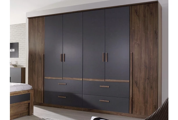 Šatníková skriňa s otočnými dverami a zásuvkami s celkovou šírkou 271 cm z kolekcie Bernau – v trendovej kombinácii dubového drevodekoru a tmavo šedej farby. Kvalitný, moderný a prakticky riešený nábytok pre komfortne zariadenú spálňu bez kompromisov.