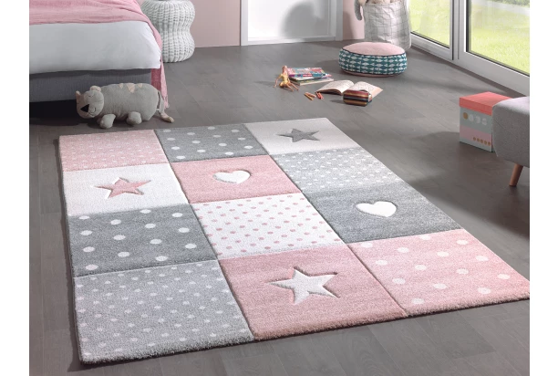 Detský koberec s hustým vlasom a ružovým farebným motívom hviezd a srdca vynikne v každej detskej izbe. Rozmery 120×170 cm.