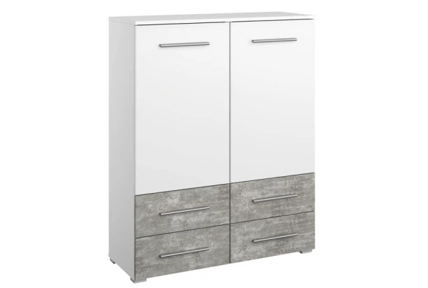 Vysoká komoda v kombinácii dverí a zásuviek z kolekcie Siegen – pre zariadenie kvalitnej a funkčnej spálne, kde sa stretáva elegancia aj módny štýl. Čisté biele plochy dopĺňajú aplikácie v imitácii šedého betónu.
