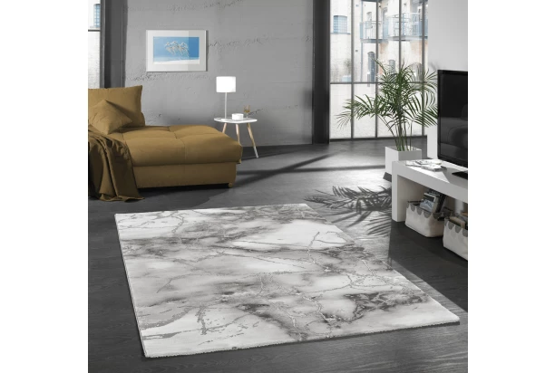 Koberec obdĺžnikový rozmer 120×170 cm s nízkym a príjemne hustým vlasom. Štýlový šedo-strieborný dizajn v mramorovej optike sa dokonale hodí do moderne zariadeného bytu.