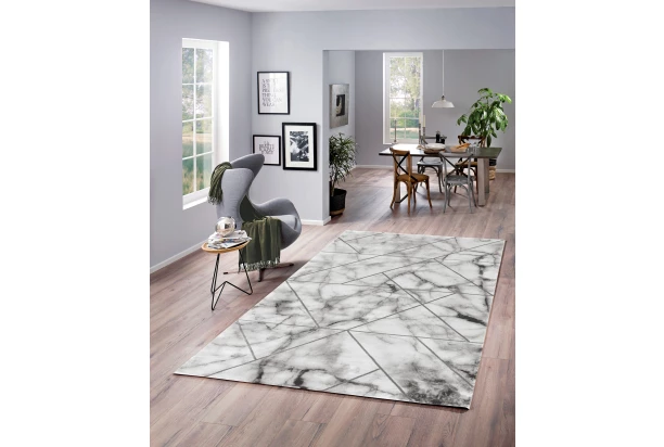Koberec obdĺžnikový o rozmere 160×230 cm s nízkym a príjemne hustým vlasom. Štýlový šedo-strieborný mramorový dizajn pripomína luxusne dláždenú podlahu a dokonale sa hodí do moderne zariadeného bytu.