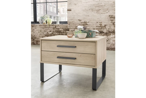Set 2 kusov nočných stolíkov z kolekcie Brüssel – moderný, štýlový a zároveň kvalitný nábytok na vybavenie praktickej spálne. Nočné stolíky sú vyrobené v kombinácii kamenný dub s tmavo šedým kovom. Konštrukciu stolíkov môžete navyše ľubovoľne doplniť osvetlenými chrbtovými panelmi so sklenenou poličkou, ktoré podčiarknu večernú atmosféru v spálni.