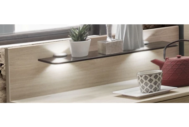 Sada 2 osvetlených nočných stolíkov z kolekcie Brüssel – moderný, štýlový a zároveň kvalitný nábytok pre vybavenie praktickej spálne. Predlžovací zadný panel v dekore kamenného duba obsahuje poličku z dymového skla a bodové svetlo, ktoré sa dá ľahko zapnúť vstavaným tlačidlom. Príjemnú večernú atmosféru si môžete ľahko vytvoriť kedykoľvek.