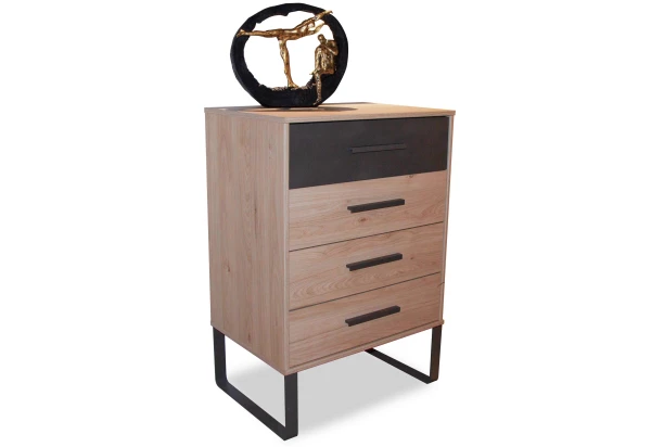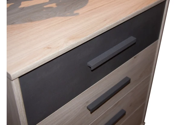 Zásuvková skrinka so šírkou 60 cm z kolekcie Brüssel – moderný, štýlový a zároveň kvalitný nábytok na vybavenie praktickej spálne. Komoda je vyrobená v kombinácii kamenný dub/imitácia šedá bridlica s tmavo šedým kovom. Skrinku môžete využiť v spálni na drobnú bielizeň alebo na univerzálne ukladanie vecí kdekoľvek inde.
