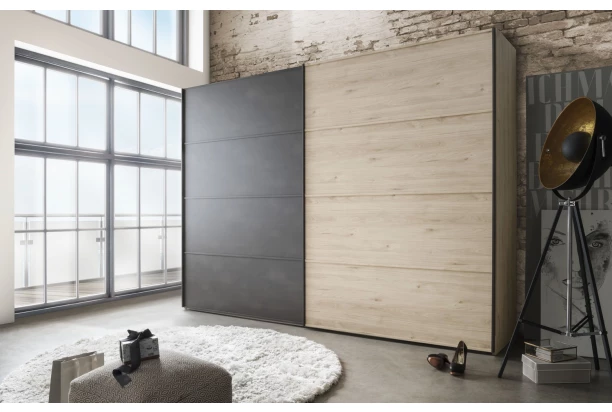 Šatníková skriňa s posuvnými dverami o šírke 250 cm z kolekcie Brüssel – moderný, štýlový a zároveň kvalitný nábytok pre vybavenie praktickej spálne. Skriňa je vyrobená v kombinácii kamenný dub/imitácia šedá bridlica s tmavo šedými kovovými úchytmi. Konštrukciu skrine môžete navyše ľubovoľne doplniť hornou lištou s LED osvetlením, ktoré vytvoria príjemnú večernú atmosféru. Posuvné dvere je možné doplniť brzdami s tlmením dojazdom.