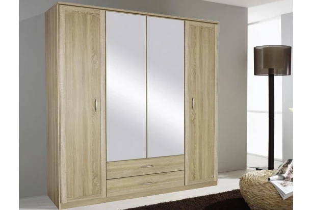 Šatník o šírke 181 cm zaujme elegantným štýlom s dekoratívnou profiláciou predných plôch. Otočné dvere doplňujú veľké zrkadlá a praktické zásuvky. Vyrobená v dekore dub sonoma.
