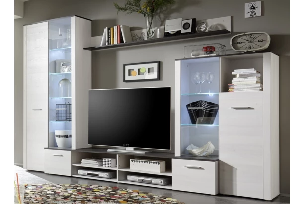 Moderná obývacia stena s úložnými priestormi, priehradkami a vitrínami s osvetlením. Bielené tóny sibírskeho smrekovca vytvárajú elegantnú a príjemne svetlú atmosféru domova. Tmavo hnedé horné plochy vytvárajú skvelý kontrast.