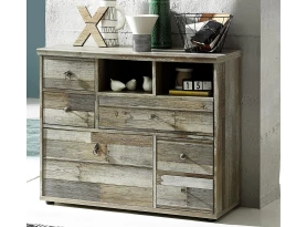 Široká skrinka na TV zo štýlovej kolekcie Bonanza – povrchy imitujúce vintage optiku oprýskaných drevených lát vnesú do vášho interiéru originalitu a zároveň inšpiráciu k zariadeniu naozaj štýlového bytu.
