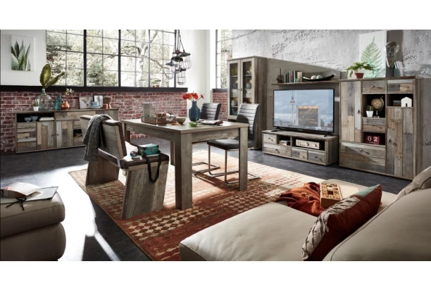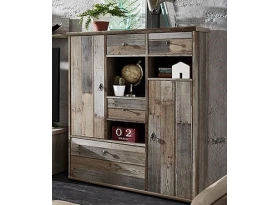Vysoká úložná vitrína zo štýlovej kolekcie Bonanza – povrchy imitujúce vintage optiku oprýskaných drevených lát vnesú do vášho interiéru originalitu a zároveň inšpiráciu k zariadeniu naozaj štýlového bytu.