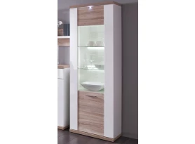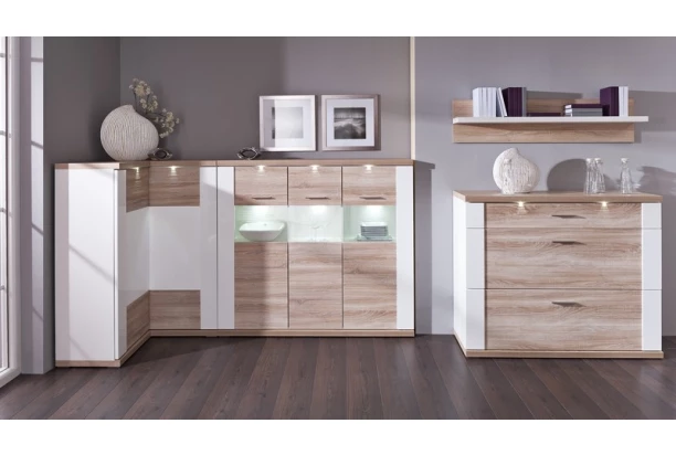 Ak chcete kvalitné a zároveň moderný dizajnový nábytok, potom je široká vitrína Caracas práve pre vás. Silný horný rám konštrukcia obsahuje bodové LED svetlo, ktoré na štruktúrovanom povrchu nábytku hrá hru svetla a tieňov a vytvára tak naozaj exkluzívne efekt. Nábytok zároveň zostáva účelný, univerzálny a praktický. V kombinácii dubového dekoru a lesklo bielej farby.
