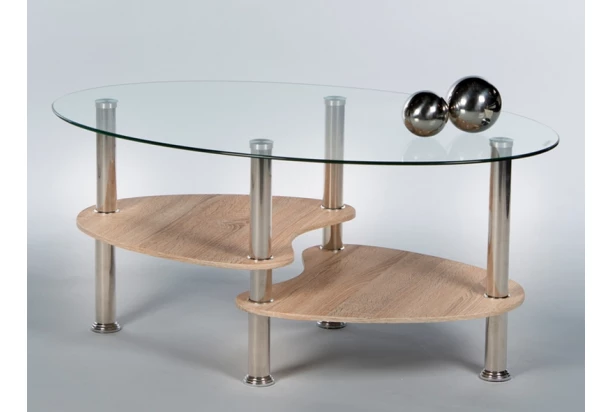 Oválny stolík z číreho skla obsahuje v dolnej časti 2 dekoratívne zaoblené police v dubovom dekore dreva.