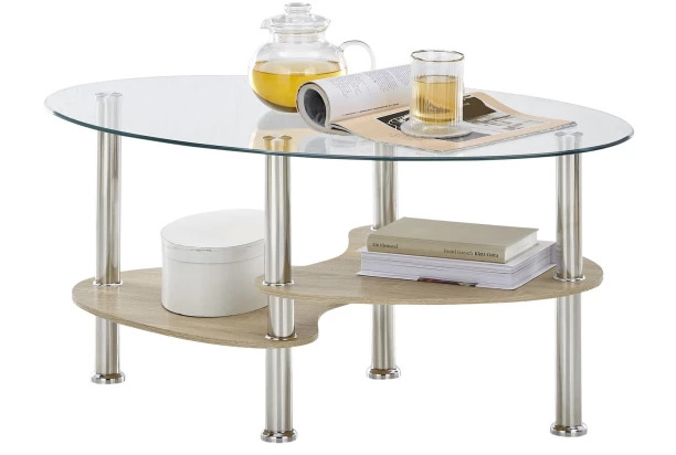 Oválny konferenčný stolík z číreho skla má v dolnej časti 2 zaoblené police, ktoré sú obojstranné – sami si tak pri montáži ľubovoľne zvolíte či chcete mať police v dekore dub sonoma alebo dub artisan.