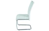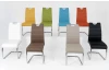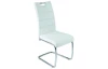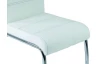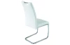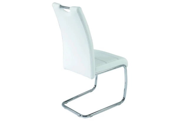 Moderná jedálenská stolička má zaoblený dizajn, chrómovo lesklou konštrukciu s praktickým madlom a komfortné sedák potiahnutý ekokožou v bielej farbe.
