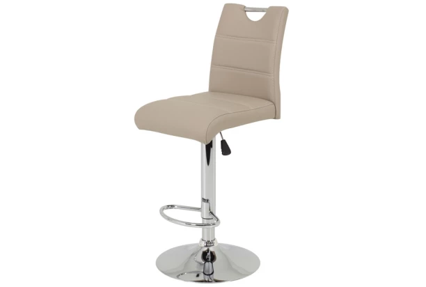 Komfortne posltrovaná barová stolička je potiahnutá ekokožou v odtieni cappuccino a obsahuje praktické kovové madlo v chrbtovej opierke.