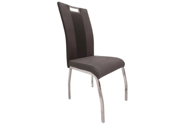 Elegantná jedálenská stolička na kovových nohách v chrómovom lesku. Pohodlné operadlo doplnené praktickým hranatým madlom pre ľahšiu manipuláciu. Očalúnenie kombináciou čiernej ekokože a šedej látky v zaujímavej optike kože.