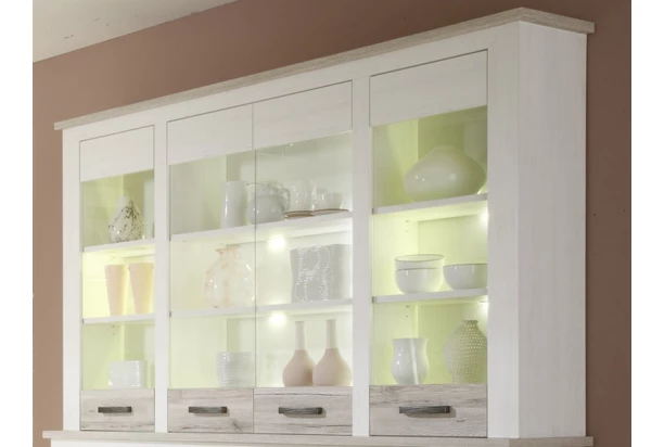 Čarovnú atmosféru vidieka prináša veľká nástavná vitrína z radu Toronto. Široké rámy konštrukcie v imitácii masívneho bieleného dreva podčiarkujú štýlovosť nábytku.