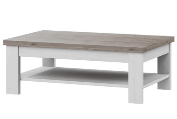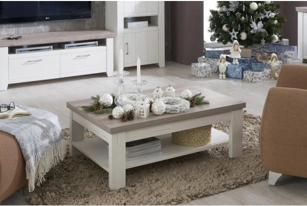 Priestranný konferenčný stolík osloví kvalitne prepracovanou konštrukciou v kombinácii bielenej pínie a šedého dubového drevodekoru.