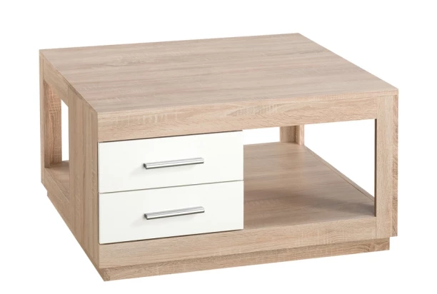 Praktický konferenčný stolík s optikou širokých rámov obsahuje dve úložné zásuvky a priestrannú odkladaciu plochu v dolnej časti. Vyrobený v kombinácii dub sonoma / biela.