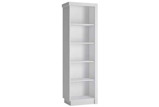 Vysoký regál z programu Lyon – moderný minimalistický štýl nábytku v bielom prevedení s lesklými rámami môžete ľahko zladiť s akýmikoľvek farbami Vášho interiéru.
