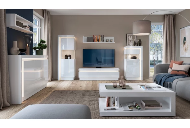 Nízka vitrína s presklením z programu Lyon – moderný minimalistický štýl nábytku podčiarkujú zaujímavo riešené rámy s podsvietením, ktoré vytvárajú pôsobivé línie v horizontálnom aj vertikálnom smere. Nábytok v lesklom bielom prevedení môžete navyše ľahko zladiť s akýmikoľvek farbami vášho interiéru.