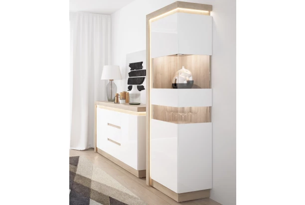 Vysoká vitrína Lyon, dub riviera/biely lesk, s osvetlením, pravá