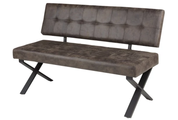 Komfortne polstrovaná jedálenská lavica s príjemným sklonom operadla má stabilnú kovovú podnož a je očalúnená hnedou látkou s vintage optikou pripominajúcu kožu. Dokonale doplní štýlovo zariadený interiér jedálne alebo kuchyne.