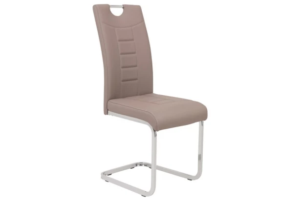 Jedálenská stolička v obľúbenej kombinácii chrómového kovu a ekokože v odtieni cappuccino je doplnená atraktívnym prešitím a horným madlom, ktoré uľahčí odsúvanie stoličky od stola.