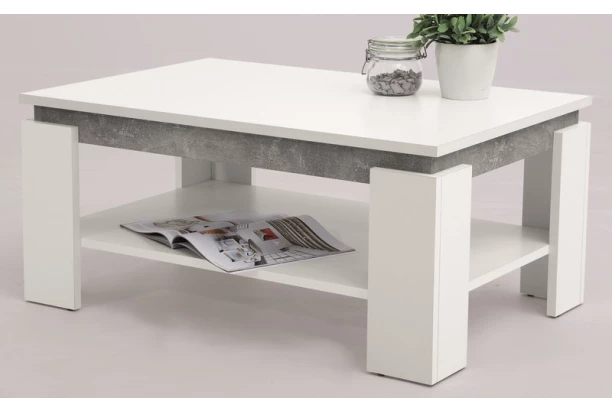 Stabilný konferenčný stolík v bielej farbe má kontrastné orámovanie v imitácii sivého betónu, ktoré dáva stolíku zaujímavú optiku. Oceníte aj priestrannú odkladaciu priehradku v dolnej časti.