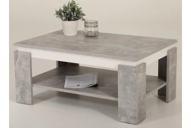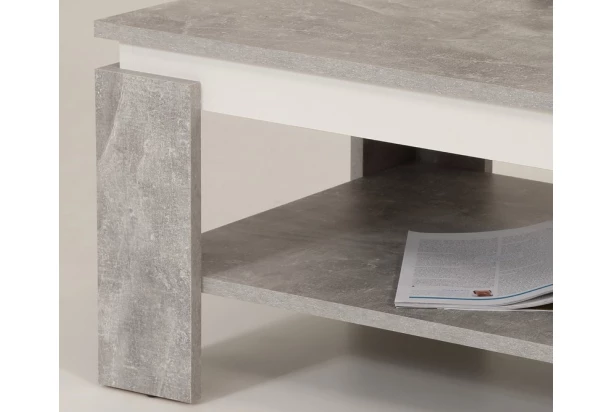 Stabilný konferenčný stolík v imitácii šedého betónu má kontrastné biele orámovanie, ktoré dodáva stolíku zaujímavú optiku. Oceníte aj priestrannú odkladaciu priehradku v dolnej časti.