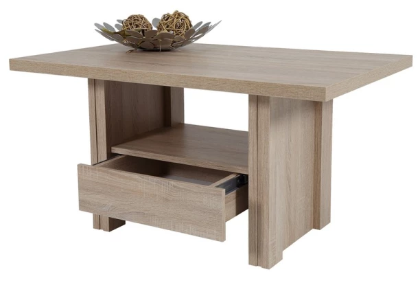 Konferenčný stolík v obľúbenom dekore dub sonoma. Zosilnená stabilná konštrukcia obsahuje odkladaciu priehradku v spodnej časti a úložnú zásuvku, kam môžete ľahko upratať veci ako napríklad noviny, telvizní program alebo čokoľvek iného.