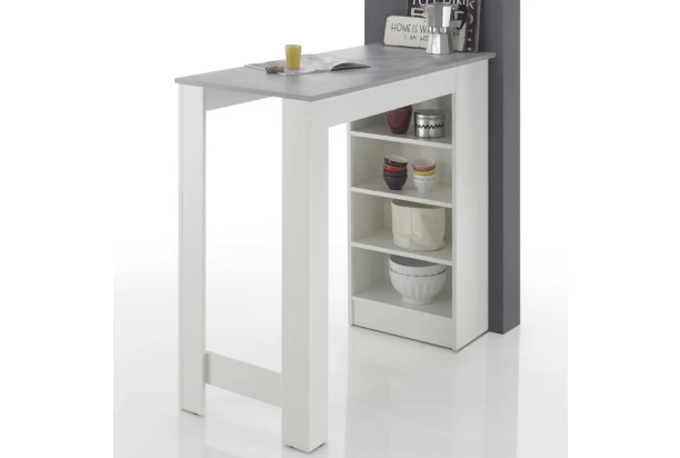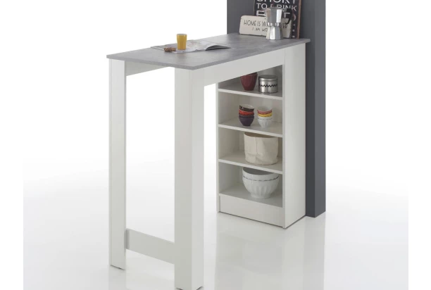 Barový stôl s bočným odkladacím regálom poslúži aj ako praktický predeľovací pult medzi kuchyňou a obývačkou. V kombinácii bielej farby a imitácie šedého betónu.