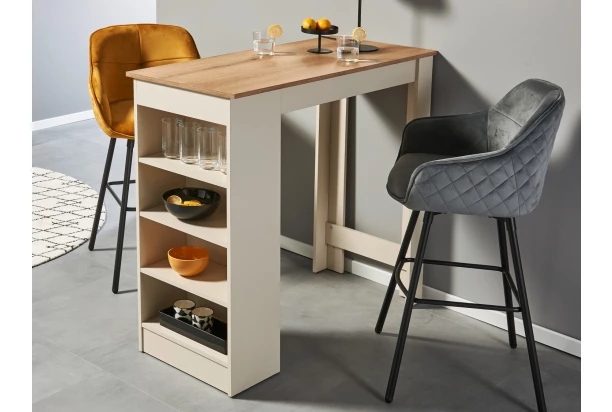 Barový stôl s bočným odkladacím regálom poslúži aj ako praktický predeľovací pult medzi kuchyňou a obývačkou. V kombinácii béžovej farby a dekoru dub evoke.