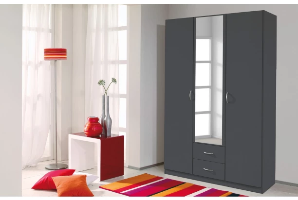 Šatníková skriňa z programu Case je vyrobená vo farbe tmavo šedá a prináša do domácnosti jednoduchú eleganciu a funkčnosť. Konštrukcia so šírkou 136 cm obsahuje 3 dvere, 1 zrkadlo a 2 zásuvky.