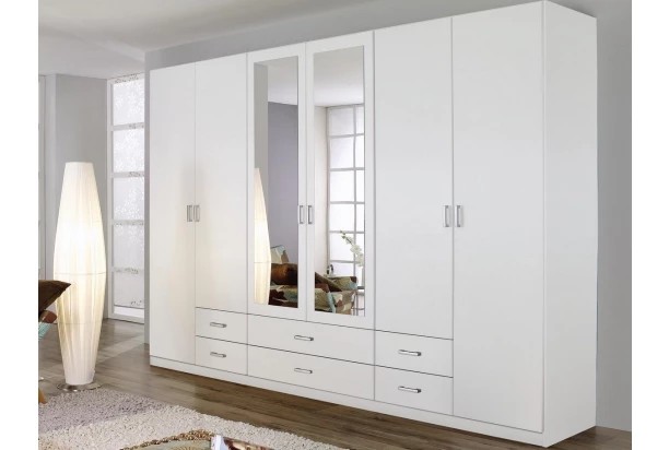 Široká šatníková skriňa s kombináciou zásuviek, dverí a zrkadiel ponúka dostatok úložných priestorov pre prehľadné ukladanie aj početného ošatenia. V prevedení alpská biela. Skriňu môžete doplniť o ďalšie vnútorné police podľa vlastnej potreby.