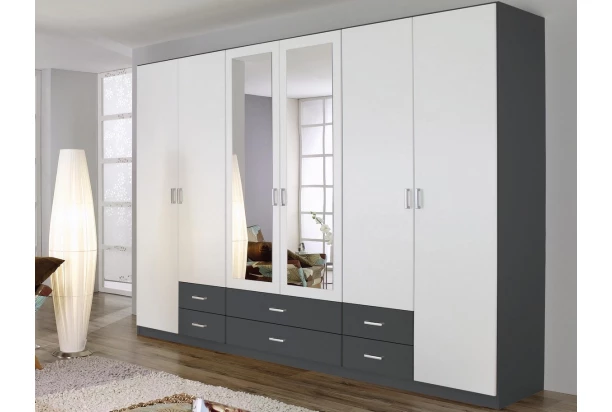Široká šatníková skriňa s kombináciou zásuviek, dverí a zrkadiel ponúka dostatok úložných priestorov pre prehľadné ukladanie aj početného ošatenia. V prevedení tmavo šedá/biela. Skriňu môžete doplniť o ďalšie vnútorné police podľa vlastnej potreby.