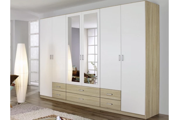 Široká šatníková skriňa s kombináciou zásuviek, dverí a zrkadiel ponúka dostatok úložných priestorov pre prehľadné ukladanie aj početného ošatenia. V prevedení dub sonoma/biela. Skriňu, môžete doplniť o ďalšie vnútorné police, podľa vlastnej potreby.