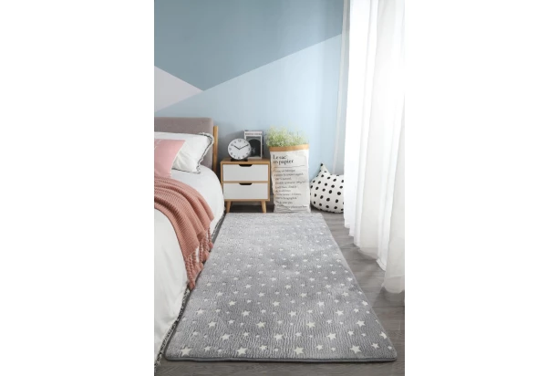 Detský koberec v šedej farbe zaujme dievčatá i chlapcov svojim vzorom hviezdičiek, ktoré svietia v tme. Mäkučký koberec príjemne zahreje chodidlá, ale hlavne rozžiari každú detskú izbičku. Rozmer 50×80 cm.