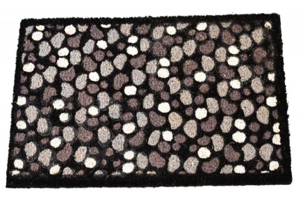 Štýlová čierna rohožka z kokosového vlákna s motívom rôzne veľkých kamienkov skvele vynikne pred vchodovými dverami, kde vrelo uvíta každého hosťa. Rozmer 40×60 cm.
