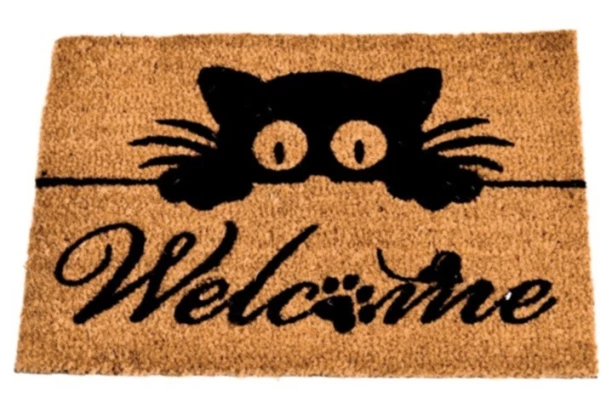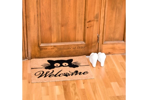 Štýlová hnedá rohožka z kokosového vlákna s motívom čiernej mačky s nápisom welcome s labkou skvele vynikne pred vchodovými dverami, kde vrelo uvíta každého hosťa. Rozmer 40×60 cm.