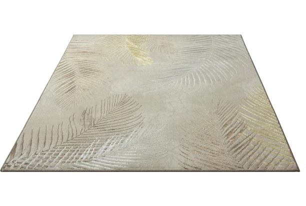 Tento štýlový koberec s elegantným 3D efektom dodá miestnosti útulnú atmosféru a pocit tepla. Krémovo-zlaté prevedenie a motív listov sa hodí do moderného aj klasického interiéru. Rozmer 80×150 cm.