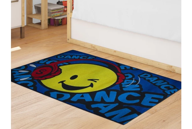 Detský koberec Smile so smajlíkom a anglickým textom Dance roztancuje všetky deti. Farebný koberec o rozmere 80×120 cm perfektne oživí každú detskú izbičku.