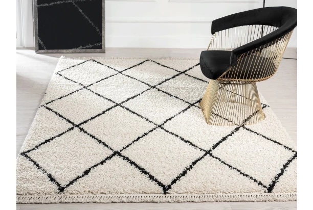 Mimoriadne nadýchaný koberec s mäkkým vysokým vlasom vytvorí príjemnú atmosféru v obývacej izbe, spálni alebo napríklad v detskej izbe. Diamantový kosoštvorcový čierny vzor na krémovom pozadí skvele zapadne do škandinávskeho štýlu bývania, teda aj moderného a minimalistického. Rozmer 80×150 cm.